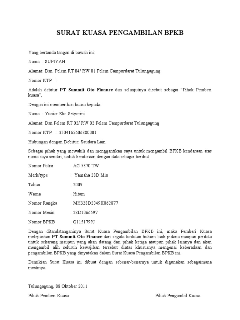 Karena itu, surat ini harus dilengkapi dengan materai 6000 serta ditandatangani oleh kamu bisa mengikuti contoh surat kuasa pengambilan bpkb mobil ini. Ada banyak perusahaan yang membeli mobil dengan cara kredit untuk keperluan operasional perusahaan mereka. Disini kami akan memberikan contoh surat kuasa pengambilan bpkb yang baik dan benar yang bisa anda jadikan contoh dengan format.doc jadi lebih memudahkan anda. Contohnya begini misalnya saya harus mengambil bpkb mobil hari ini. Contoh surat kuasa untuk pengambilan bpkb di fif.